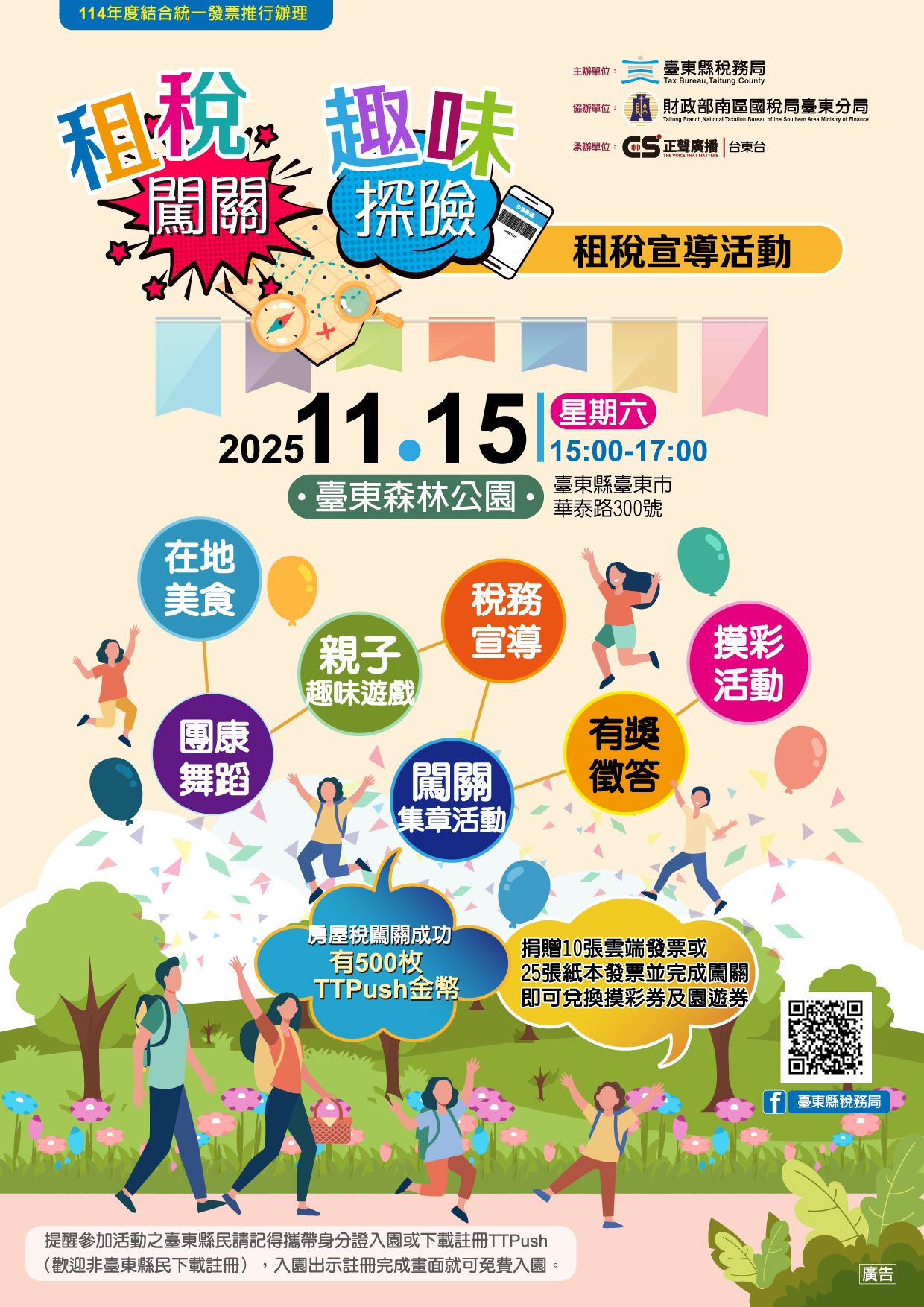 為推廣租稅教育、增進民眾對“稅”的認識,臺東縣稅務局將於11月15日(星期六)下午3時,假臺東森林公園舉辦「租稅闖關‧趣味探險」租稅宣導活動。活動內容豐富多元,結合健走、闖關遊戲與雲端發票宣導等元素,邀請大小朋友一同參與,在歡樂中學習租稅知識。